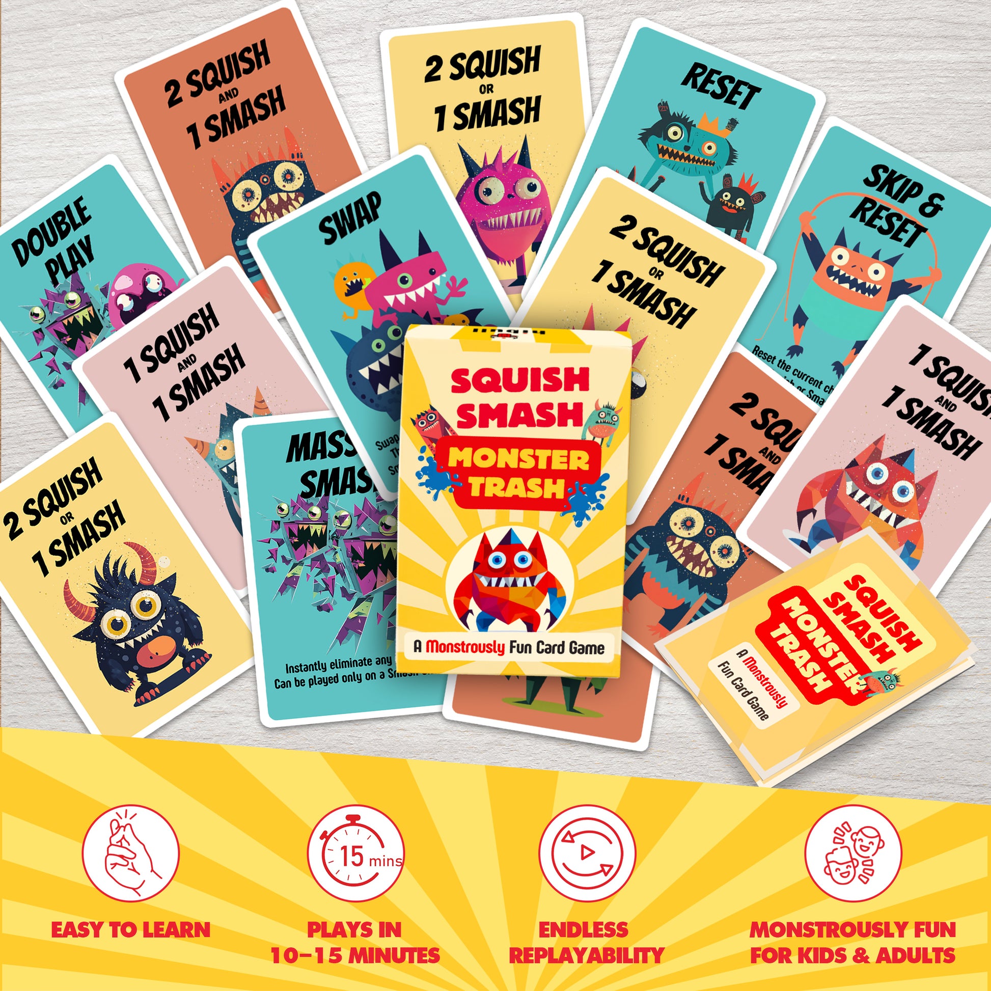 Race to Squish Smash Monsters in a Chain-Reaction Card Game.